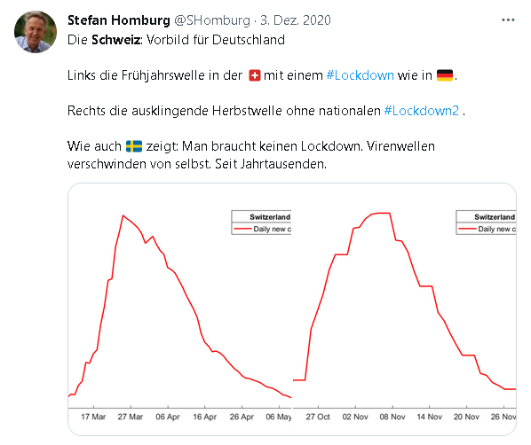 Hier zeigt @SHomburg 2 Wellen die #fast_identisch aussehen und belegen sollen, das kein Lockdown benötigt werde, die Wellen verschwänden von selbst, meint er. Schauen wir nochmals auf diese fast gleichen Verläufe. Was könnte daran falsch sein?