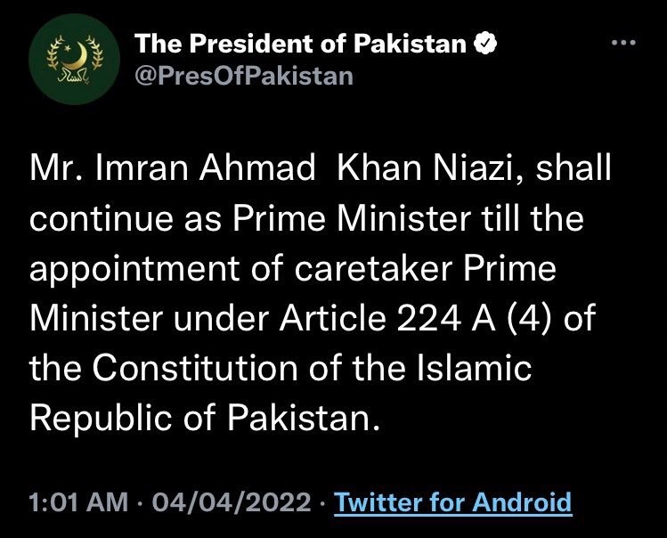 Inzwischen hat Präsident Arif Alvi das Parlament von aufgelöst und damit den Weg freigemacht für vorgezogene Neuwahlen. So wie ich das verstanden habe, bleibt bis dahin geschäftsführend als Ministerpräsident im Amt. Andere Meldungen berichten von Amtsverlust.