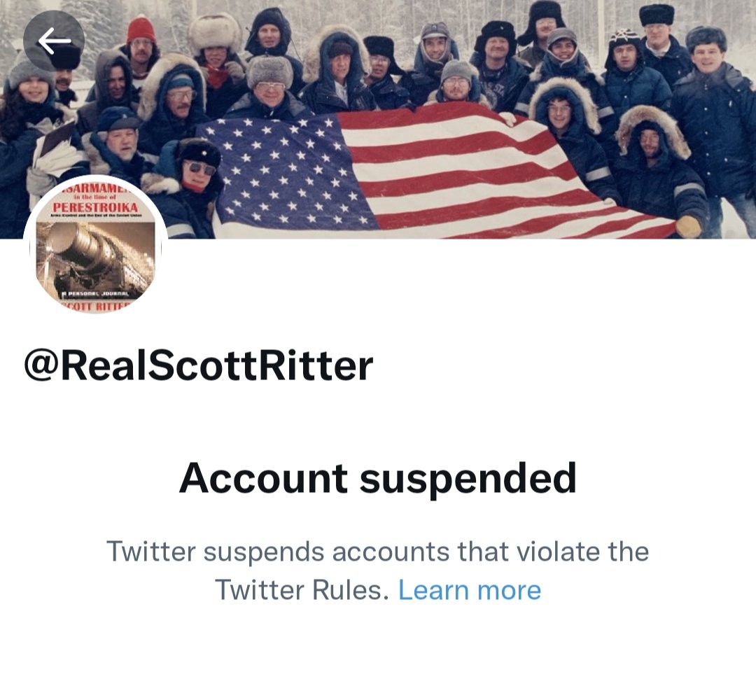 Twitter's political censorship is so, so ridiculous: It just suspended the account of @RealScottRitter, an ex UN arms inspector and US Marine Corps intelligence officer
