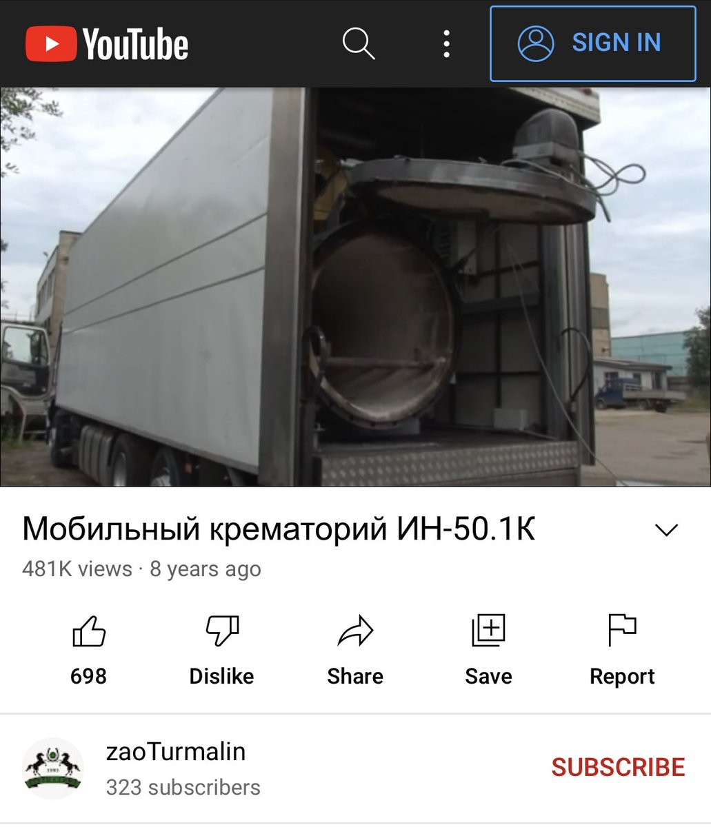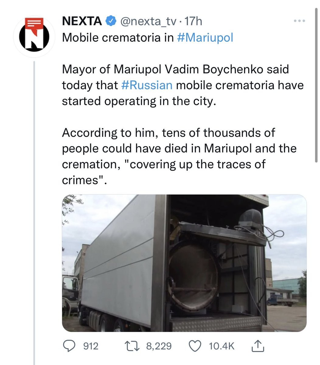 An image from an 8 year old YouTube video is being shared, starting yesterday, as if it’s a current photo of a mobile crematorium being used by Russia to hide causalities