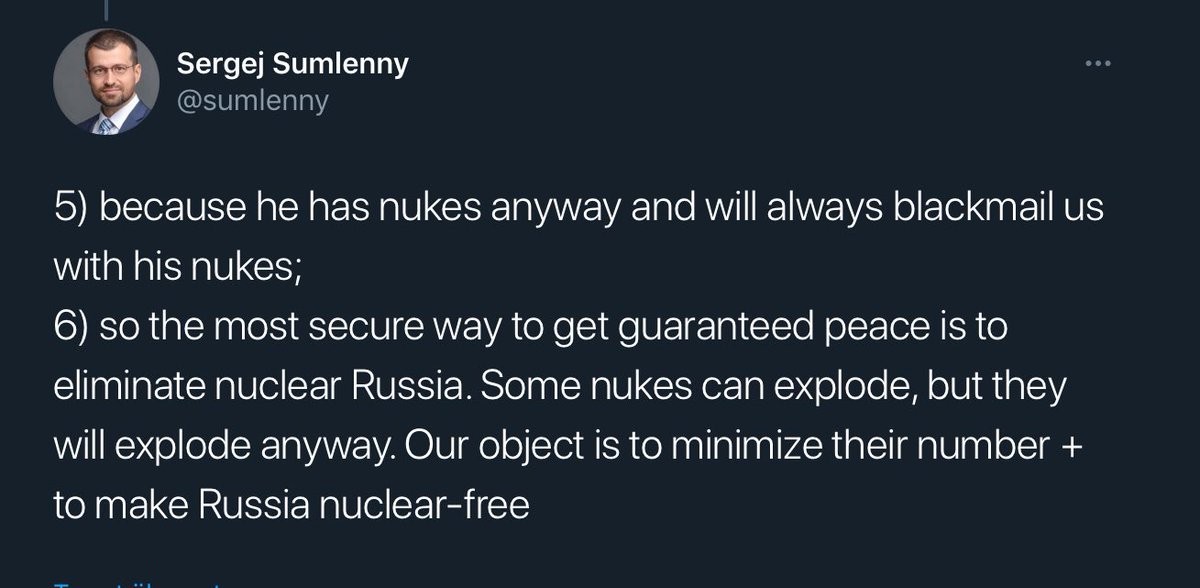 Hier auf Twitter ruft gerade ein durchgeknallter #Atomkriegsleugner einen atomaren Enthauptungsschlag gegen Russland zu führen. Sumlenny (alias Dr. Strangelove) war bis 2021 Leiter der Heinrich-Böll-Stiftung in Kiew.