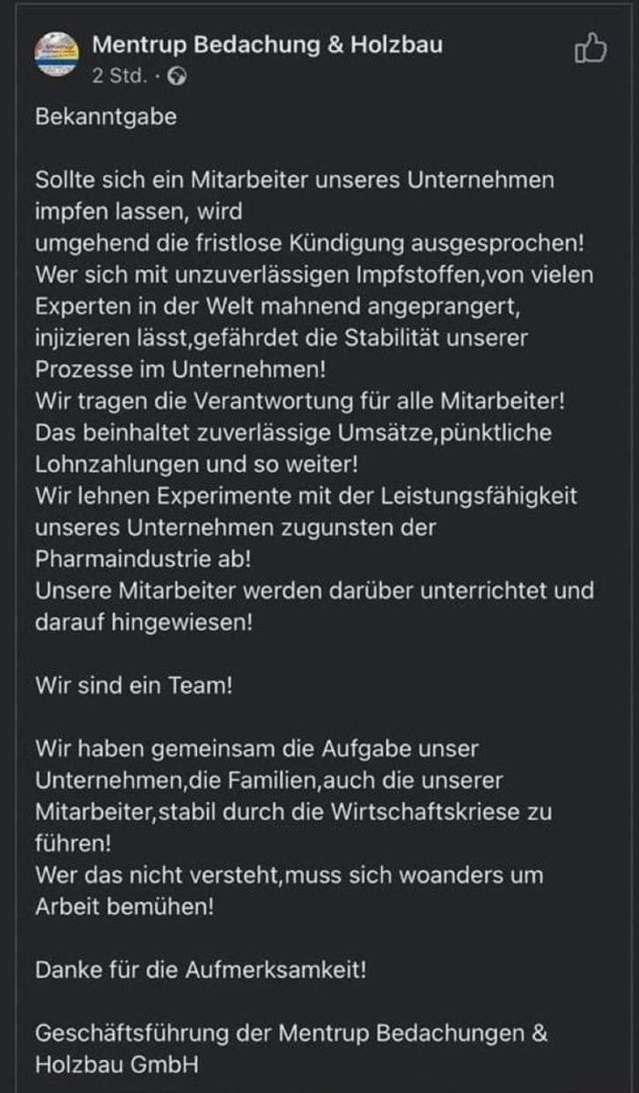 Dachdecker droht seinen Mitarbeitern mit fristloser Kündigung im Falle einer Impfung. Die wäre zwar unwirksam, aber die Ankündigung wirkt trotzdem.