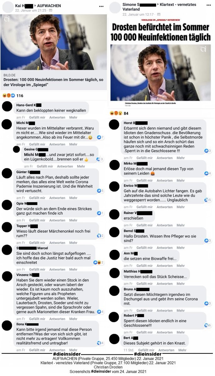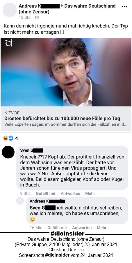 @c_drosten warnt vor einer weiteren Eskalation der #coronavirus-Pandemie und die Menschen in den @FacebookDE-Gruppen (> 25k Mitglieder) ergehen sich in Gewalt- und Tötungsphantasien.