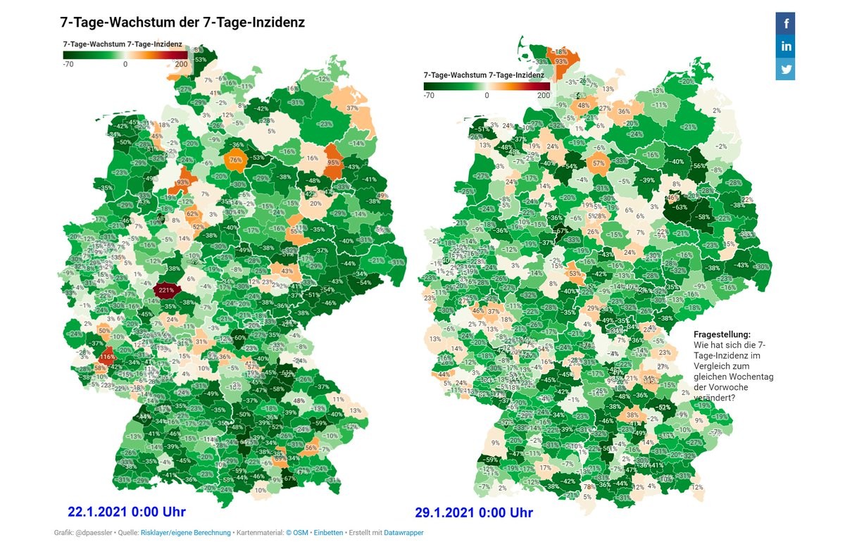 Ob das Virus in einem Landkreis auf dem Rückzug ist, oder ob es sich beschleunigt weiter ausbreitet, erkennt man am Wachstum der Inzidenz über die letzten 7 Tage.