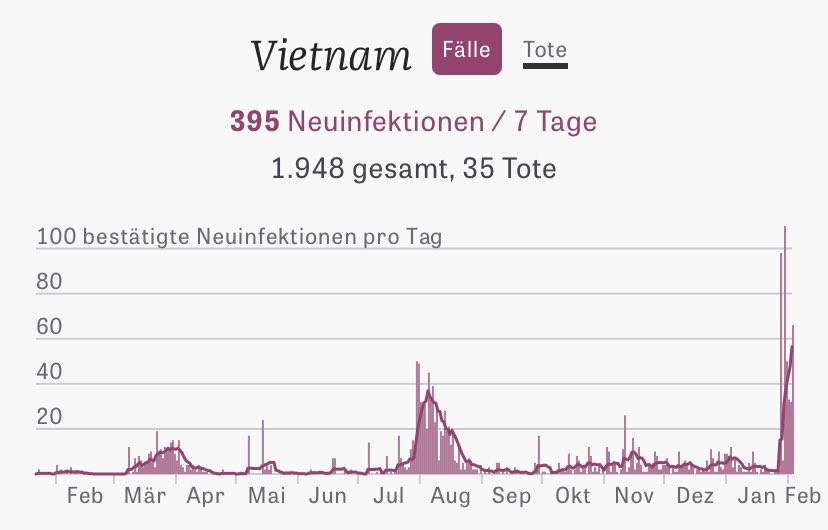 In kam es kurz vor Tết (Mondneujahr) zu einer dritten Welle: Seit dem 28. Januar wurden 395 Neuinfektionen gemeldet. Schulen und Unis sind zu, Feuerwerk wurde größtenteils abgesagt, es gibt harte lokale Lockdowns, Massentests, penible Kontaktnachverfolgung. Thread