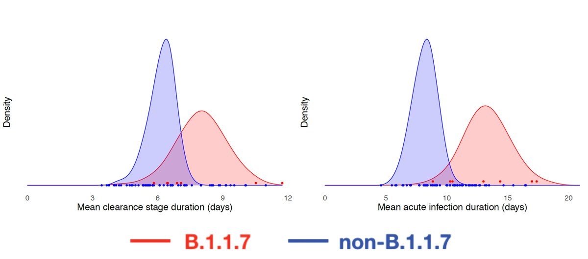 We thought B.1.1.7's increased infectiousness was due to higher viral load. New data from @NBA players and staff, with frequent sampling, suggests it's related to delayed clearance, longer duration of infections