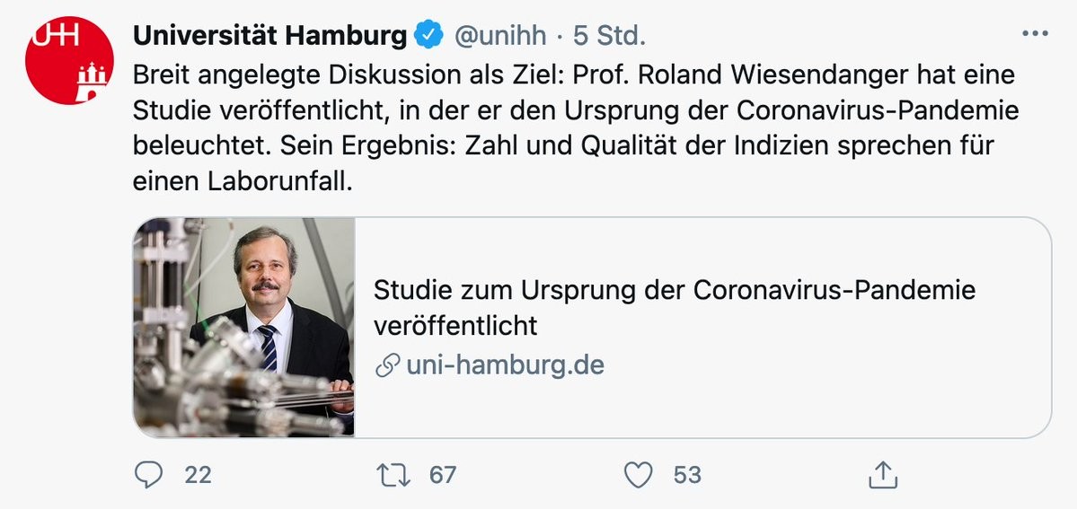 Die @unihh verbreitet eine "Studie" über den Ursprung der Coronavirus-Pandemie und zerstört damit wissenschaftliches Renomee einer Institution. Der @ndr und co. springen auf.