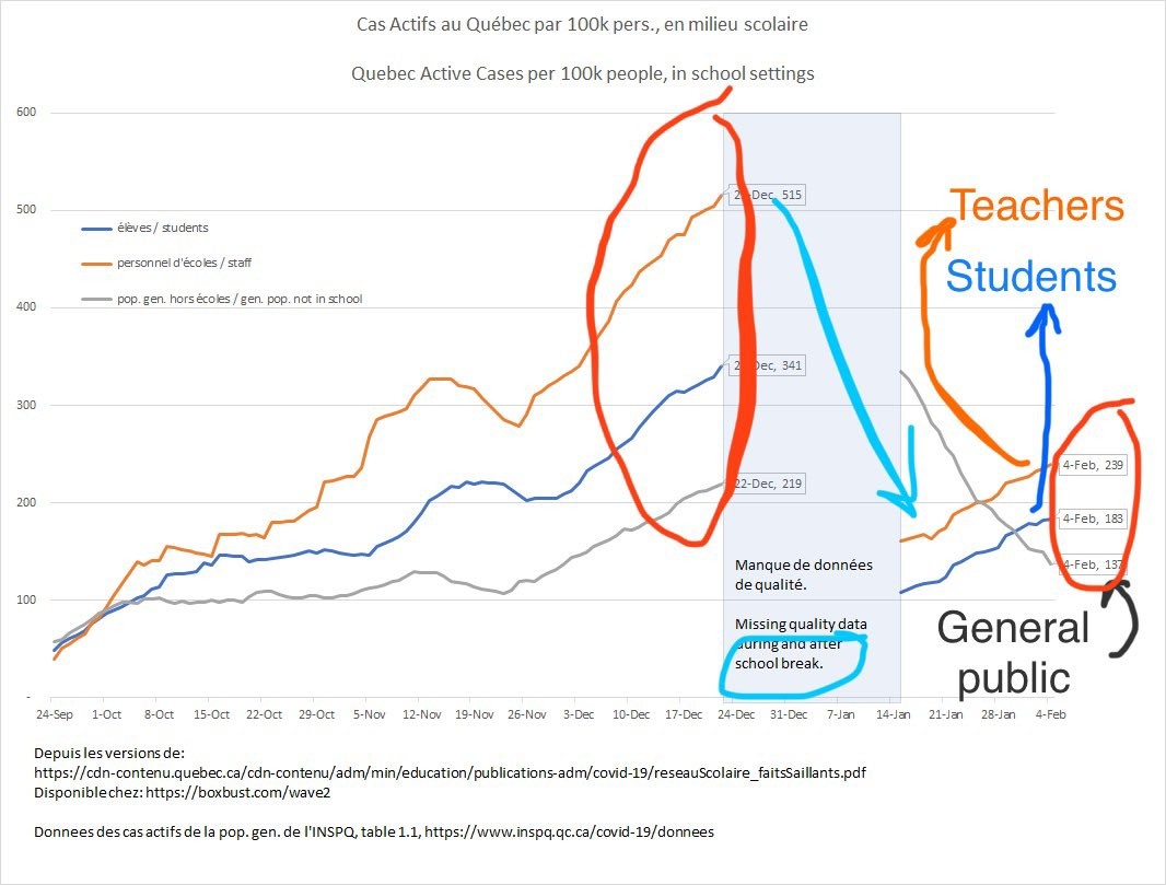 TEACHERS & STUDENTS Covid in Quebec🇨🇦—Active #COVID19 cases surged faster in teachers & students than Quebec public.