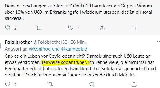 Ein #Covidiot meinte gerade, es sei für Ältere ein Glücksfall an COVID-19 zu erkranken und daran zu versterben. Denn ohne COVID-19 wäre man ja "teilweise sogar früher" gestorben!!