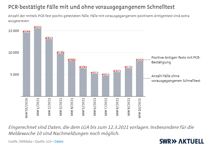#Schnelltests treiben die Inzidenzen in Baden-Württemberg nicht nach oben. Das zeigt unsere @SWRdata Datenanalyse für @SWRAktuellBW. Nur 3-5% der pro Woche gemeldeten Infektionsfälle sind demnach auf einen #Schnelltest zurückzuführen, das sind nur wenige hundert Fälle/Woche.
