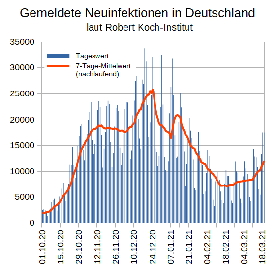 Auch heute steigt die Zahl der gemeldeten #Corona-Neuinfektionen wieder deutlich an: Der Tageswert von 17.482 liegt 36 % höher als letzten Freitag. Der 7-Tage-Mittelwert steigt auf 11.996, das sind 33 % mehr als vor einer Woche. [1/x]