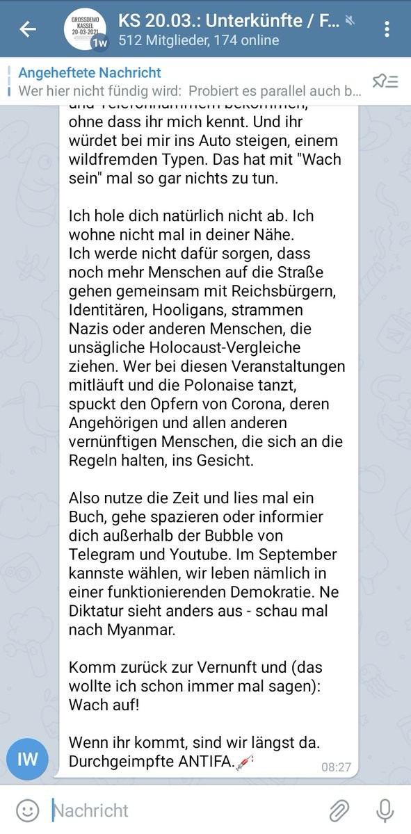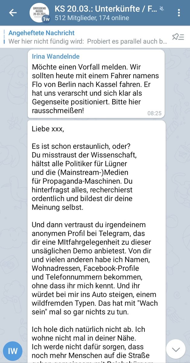 Na sowas aber auch. In der Fahrgemeinschafts-Gruppe zu #ks2003 waren einige Quer'denker' mal wieder zu leichtgläubig und wurden von Antifas verarscht. Hier z.B. Irina 🤷🏼♀️😂🤡🍿 #kassel #dankeantifa #querdenken #coronaleugner #coronazis