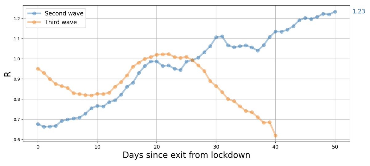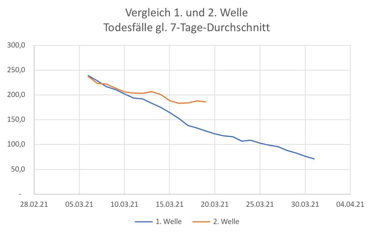 Vor ein paar Tagen habe ich den untenstehenden Vergleich zu den Todesfällen der 1. und 2. Welle gepostet. Ich habe damals geschrieben, dass der parallele Verlauf sich bald ändern wird.