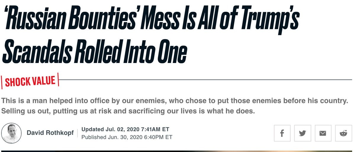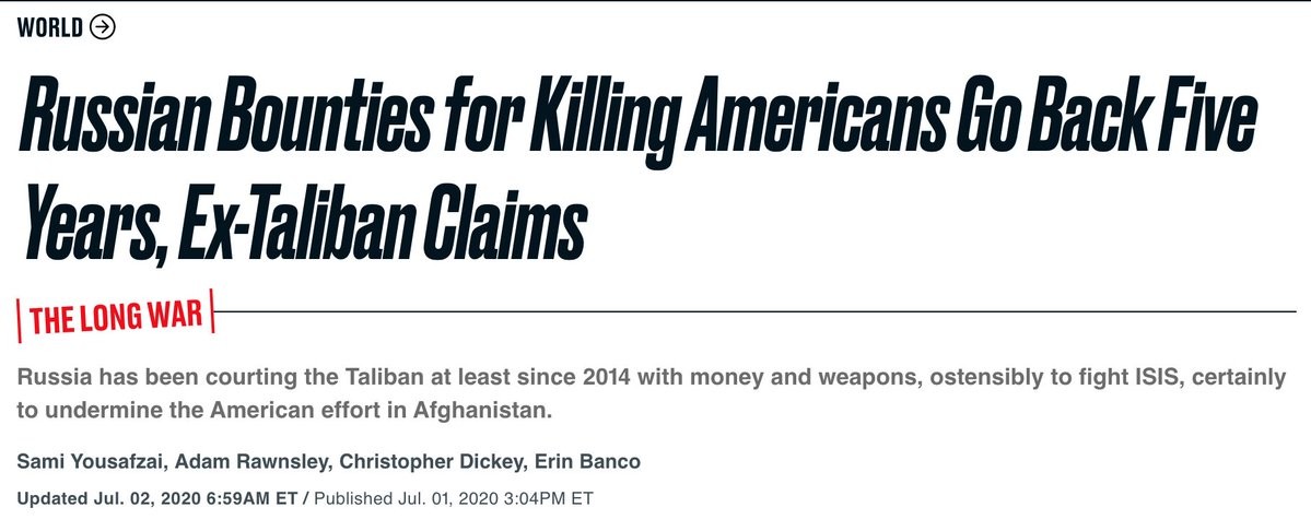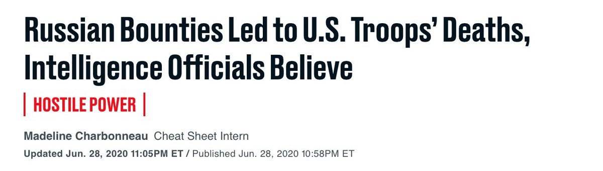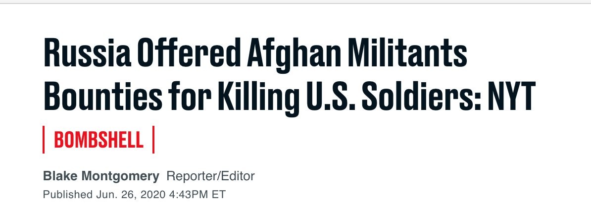 "It was a blockbuster story....The Kremlin had spread money around [Afghanistan] for militants to kill US forces. It sparked a massive outcry from Democrats...But on Thursday, the Biden Admin. announced that U.S. intelligence only had “low to moderate” confidence in the story." https://twitter.com/NoahShachtman/status/1382713472056709123