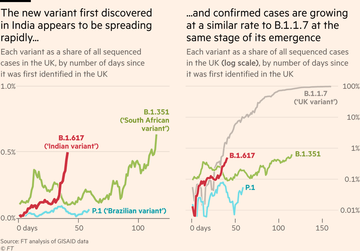 NEW: the variant thought to be responsible for fuelling India’s grim second wave (B.1.617) has been found in the UK, and numbers are rising relatively quickly in Britain.