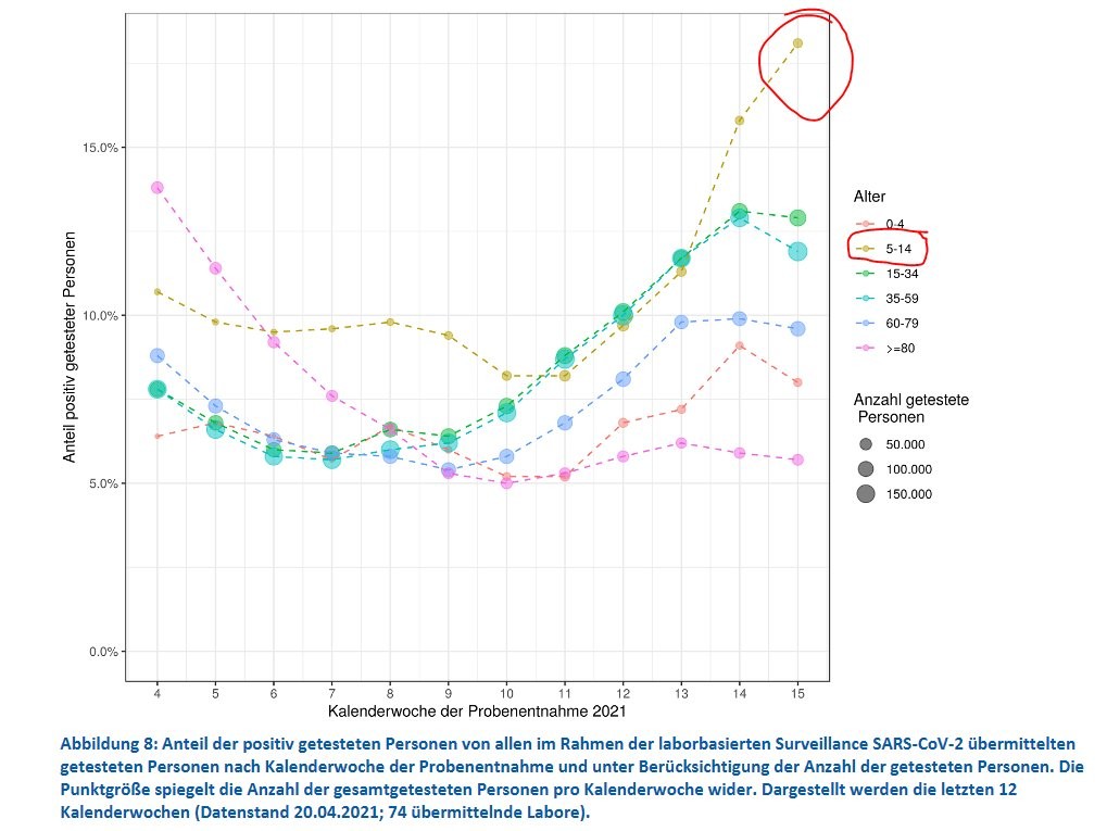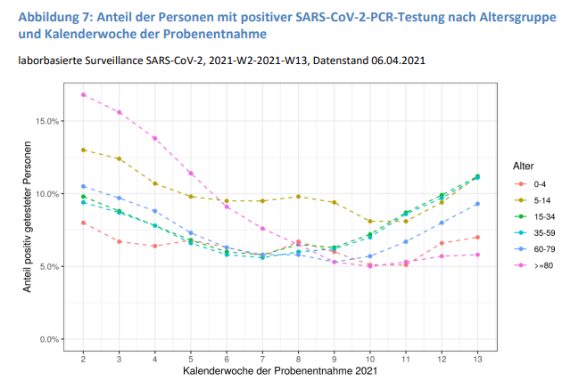 Die Positivraten sind nicht mehr annähernd parallel, sie schießen in einer Altersklasse geradezu durch die Decke.
