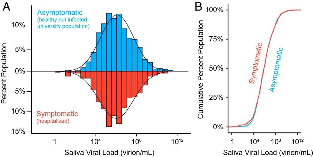 1) the distribution of viral loads observed in asymptomatic population was indistinguishable from what has been reported in hospitalized populations 1/