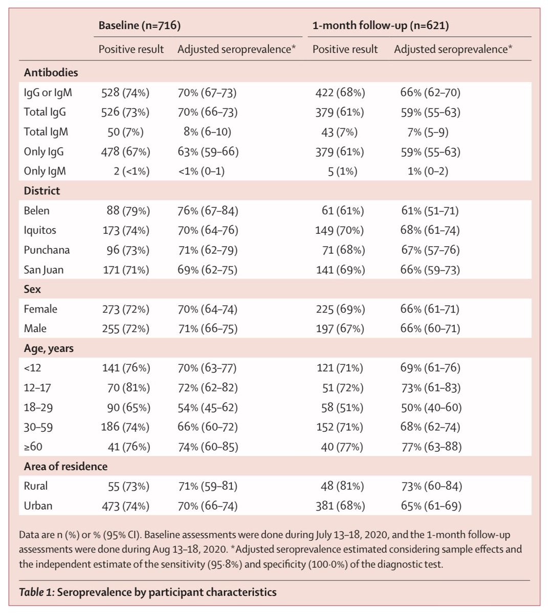 Representative antibody study of Iquitos, Peru, after their devastating 1st wave. Over two-thirds of the sample had SARS-CoV-2 antibodies, suggesting 70% of the city had been infected. Children were more likely to have antibodies than adults (except >=60).
