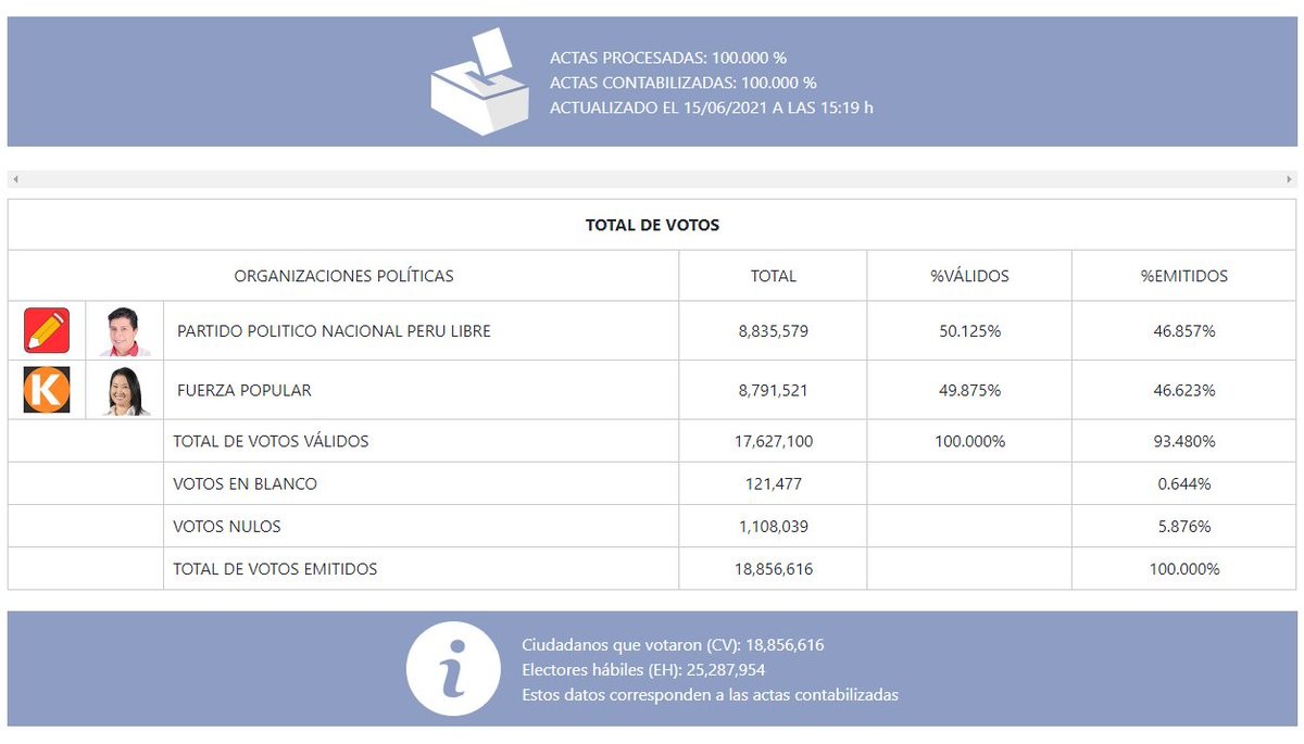 #ONPEinforma [ACTUALIZACIÓN DE RESULTADOS] Actas contabilizadas para fórmula de presidente y vicepresidentes a las 15:19 horas del 15 de junio.