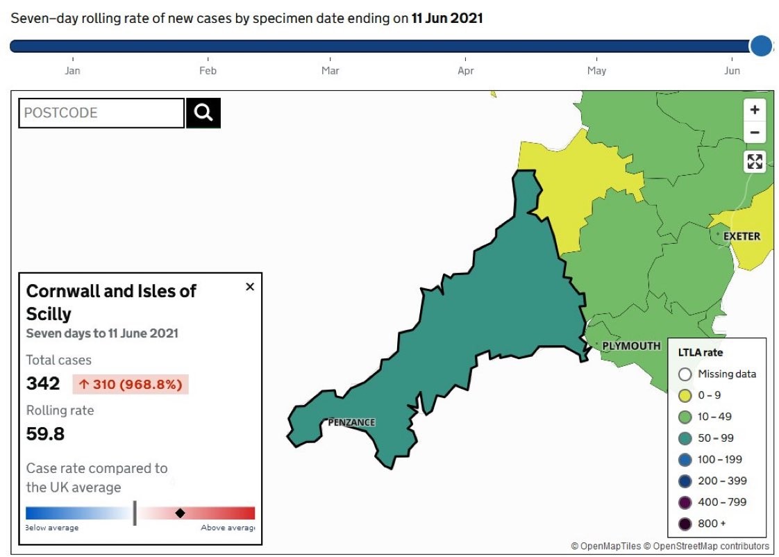 Jeez—an explosive 968% spike in #COVID19 in just one week—where the G7 Summit recently took place (and many security planners arrived 2 weeks ago). Is this related to the #G7Cornwall #G7Summit2021? Hmm, but a ~1000% increase is not something seen everyday.
