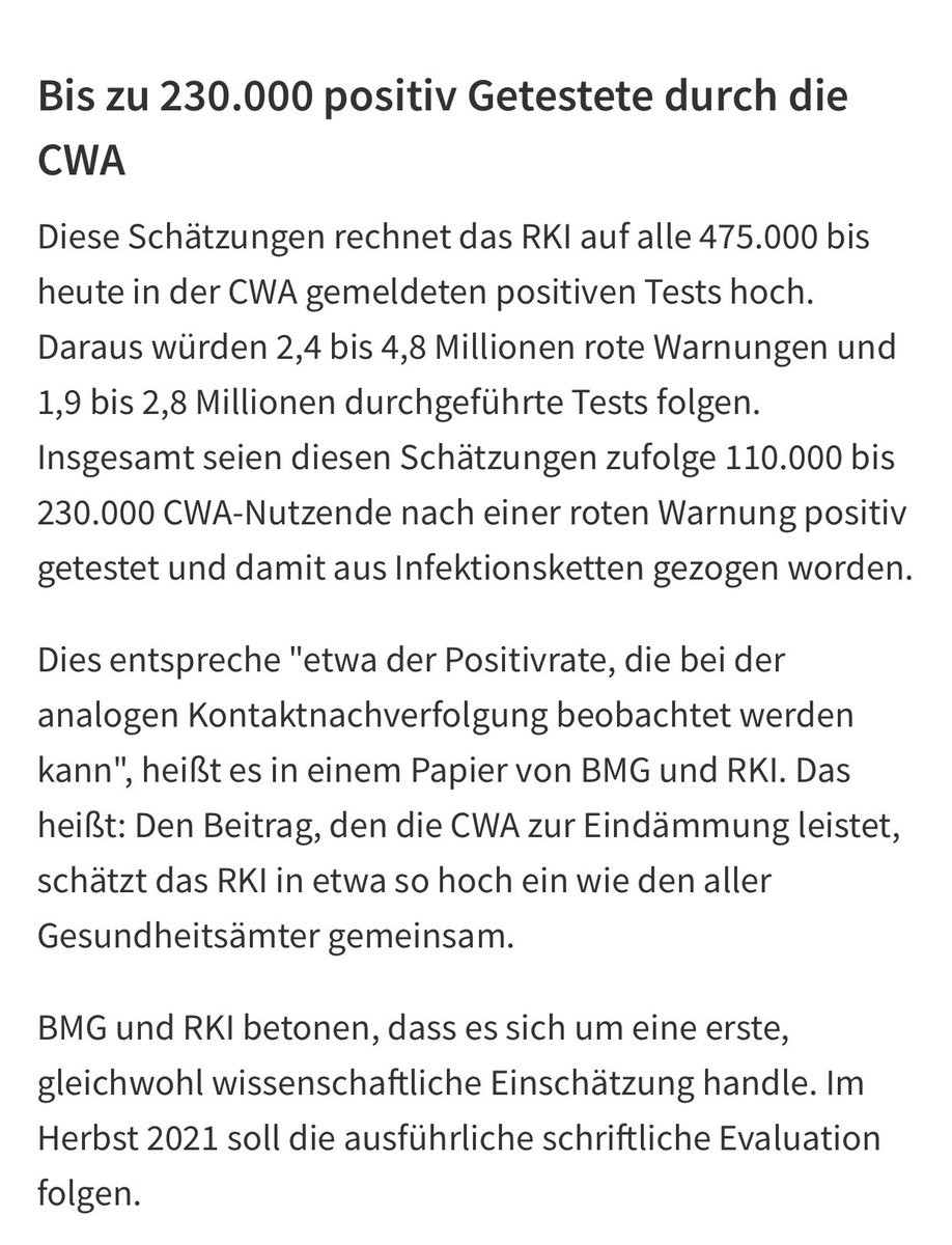 Die Evaluation des RKI zur Corona Warn App zeigt, dass diese mehr als 100.000 Positive isolieren konnte. Das ist halb so viel wie ALLE Gesundheitsämter zusammen. Die App ist viel besser als ihr Ruf. Ich packe meinen Impfausweis darauf. https://www.heise.de/amp/news/RKI-Schaetzung-Warn-App-hat-mehr-als-100-000-Infektionsketten-unterbrochen-6070747.html?__twitter_impression=true