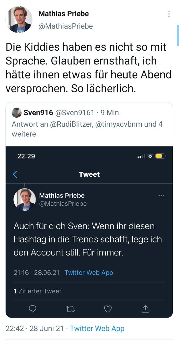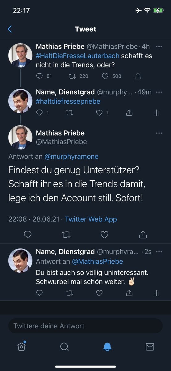 Schon spannend manchmal, diese sozialen Medien: Mathias Priebe, der gerne gegen Lauterbach hetzt, kündigt an, seinen Account zu schließen, wenn #haltdiefressepriebe als Hashtag in die Trends käme. Derzeit ist es #6 in D, nur noch unter #DankeKarl https://twitter.com/MathiasPriebe/status/1409603472698265604