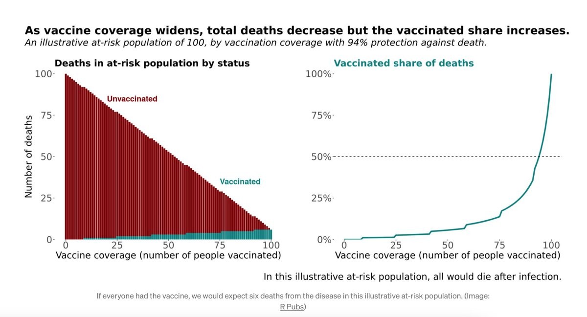 Um noch etwas mehr Klarheit und Einfachheit (Simplicity) hereinzubringen: Klar, 50% der Todesfälle mögen von Geimpften stammen. Wenn 100% geimpft wären, dann würden auch 100% aller Toten von Geimpften stammen.
