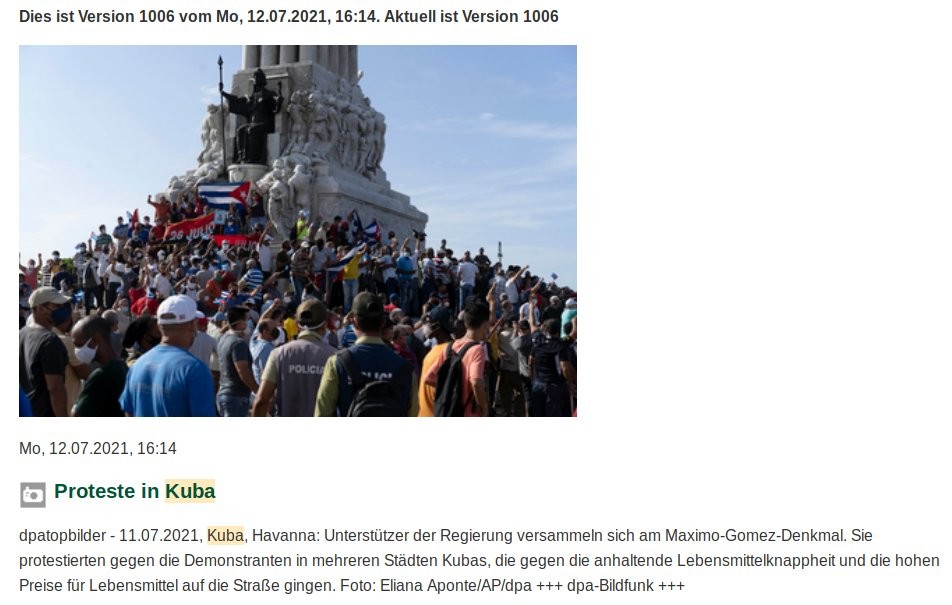 Links eine dpa-Bildmeldung. In den Angaben wird klar von Unterstützern der Regierung Kubas gesprochen.