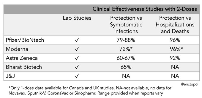 Der derzeitige Stand zum Schutz der verschiedenen Impfstoffe vor Delta, zusammengefasst von @EricTopol. Wichtig: Auch wenn der Schutz vor einer symptomatischen Infektion doch geringer ist als beim Wildtyp bleibt ein ausgezeichneter Schutz vor einem schweren Verlauf.