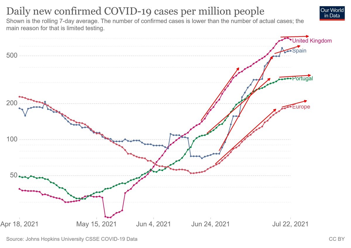 Erfreuliche Entwicklung: #Delta-Welle schwächt sich überall in Europa ab.