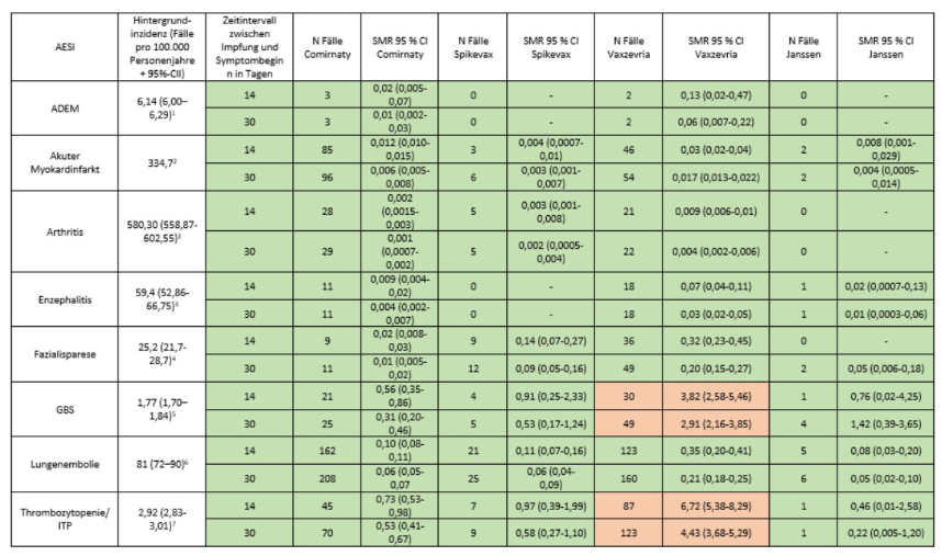 Schaut man in den aktuellen Sicherheitsbericht des PEI zu Coronaimpfungen, dann ist da Seite 24 am interessantesten, wo die Häufigkeit schwerer Vorfälle nach Impfungen mit den erwarteten Werten verglichen wird. Danach sind nur die Thromozytopenie 1/