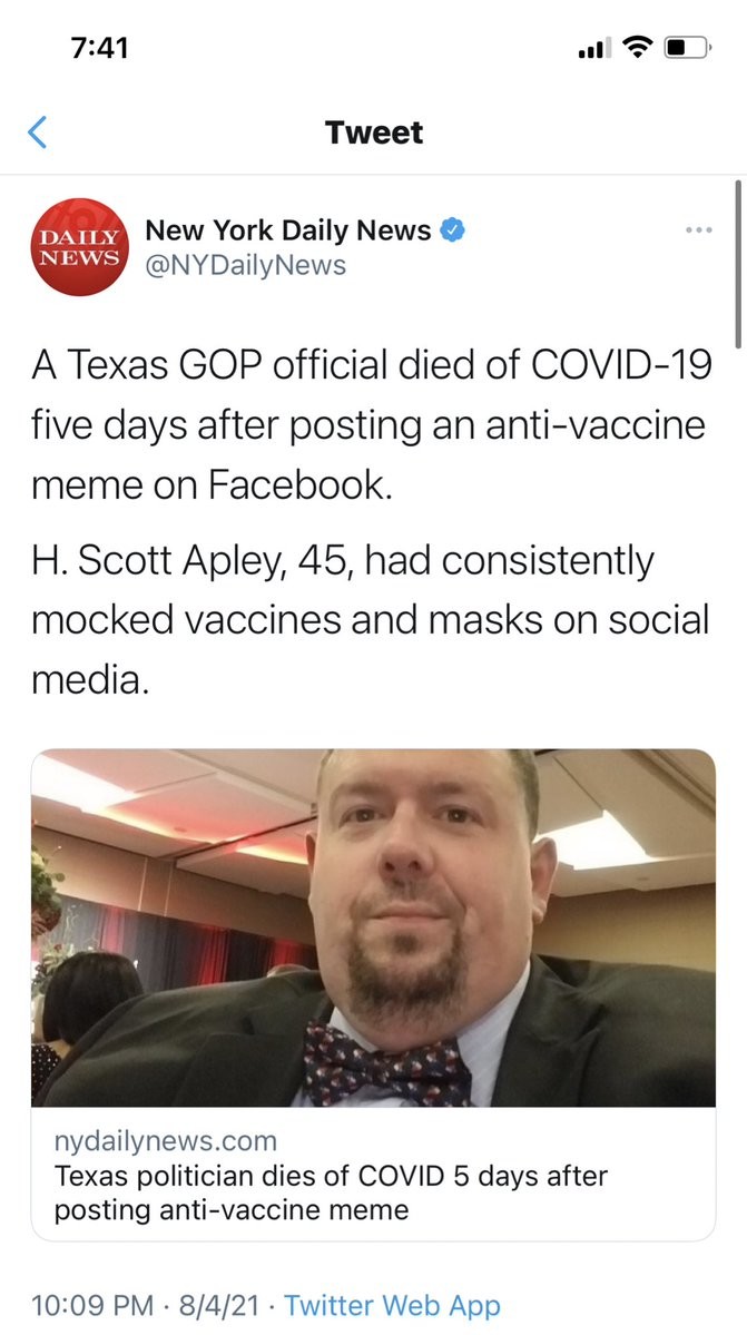 Dickinson City, Texas Council and State Republican Executive Committee member H. Scott Apley, 45, died today. Mr. Apley celebrated ‘mask burnings’, mocked Covid and called vaccines the enemy of the people. Predictably the family setup a G…