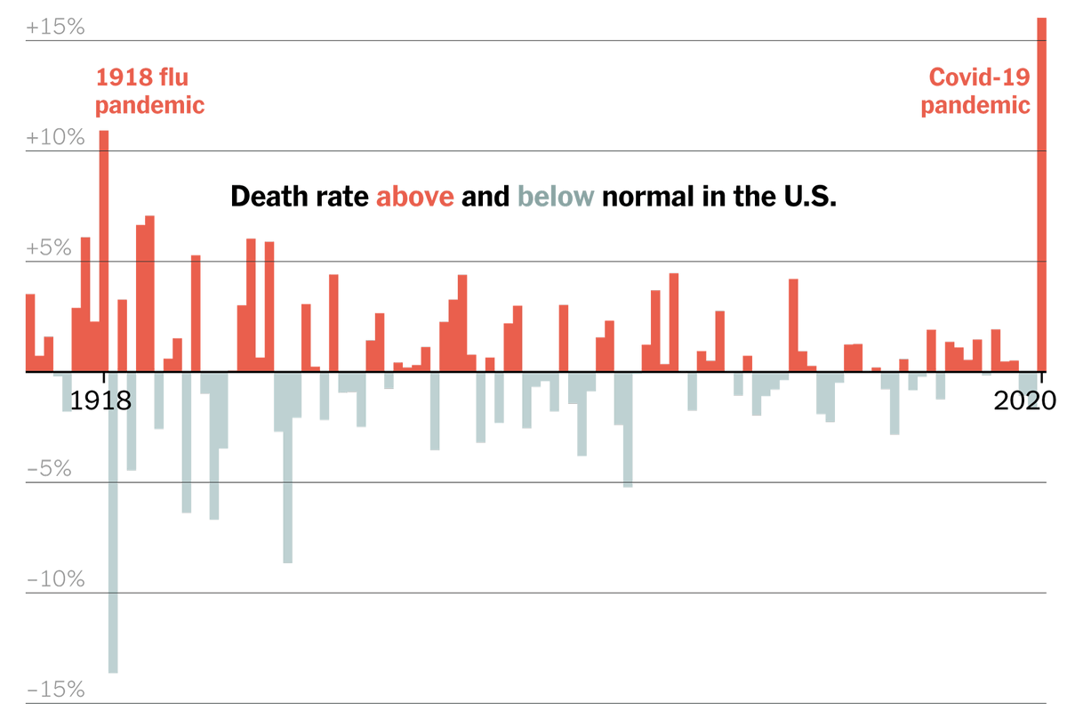 Hier die entsprechenden Zahlen für die USA. Diesmal ist auch 1918 (Spanische Grippe) mit enthalten.