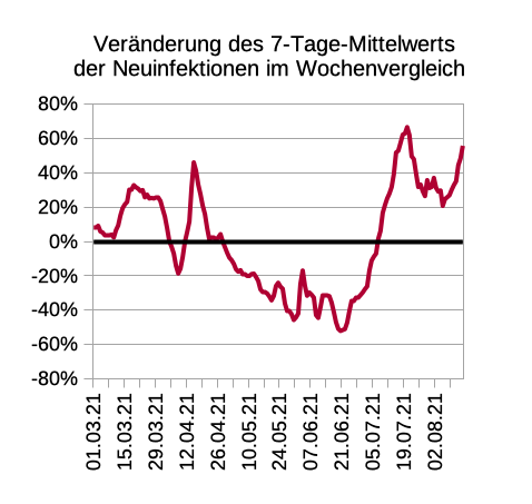 @rki_de Der 7-Tage-Mittelwert der #Corona-Neuinfektionen liegt heute 55,7% über dem vor einer Woche. Das Tempo des Wachstums steigert sich also weiter deutlich. Es hat sich seit dem Tiefstand vor 9 Tagen fast schon verdreifacht. Die rote Kurve zeigt daher steil nach oben. [2/x]