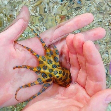 Das ist ein Blaugeringelter Krake, eines der giftigsten Tiere der Welt. Wird man gebissen, kommt es innerhalb ein bis zwei Stunden zur vollen Lähmung der Atemmuskulatur.