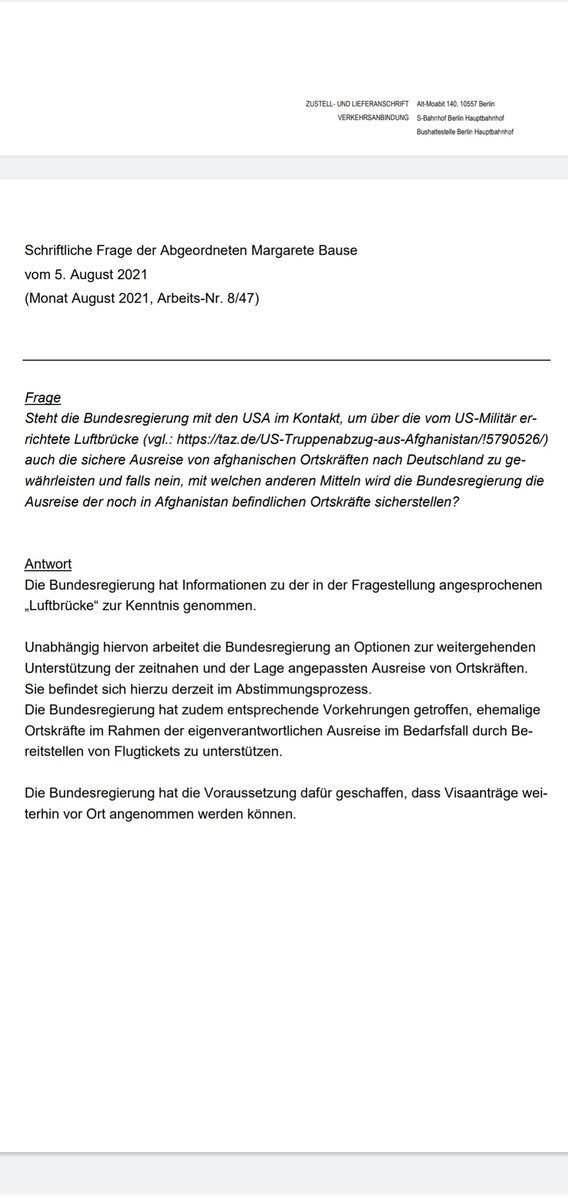 Nur EIN Dokument des unfassbaren Versagens der BReg bei der Rettung afgh. . Noch vor 4 Tagen schreibt mir das IM, dass man die "eigenverantwortliche Ausreise" ggf. durch Flugtickets unterstützen will und die US-Luftbrücke ignoriert. Es ist so erbärmlich!