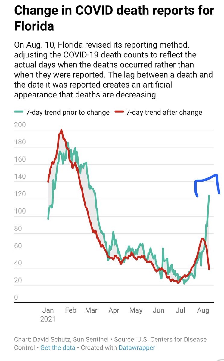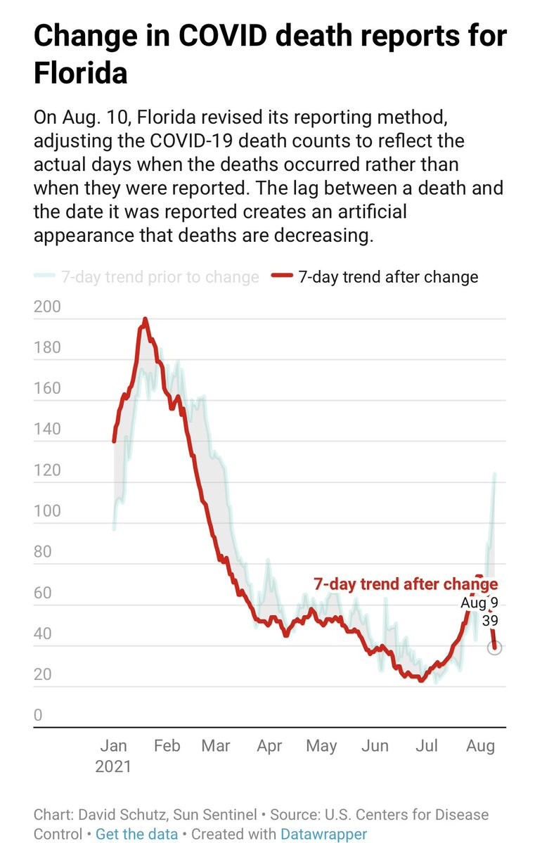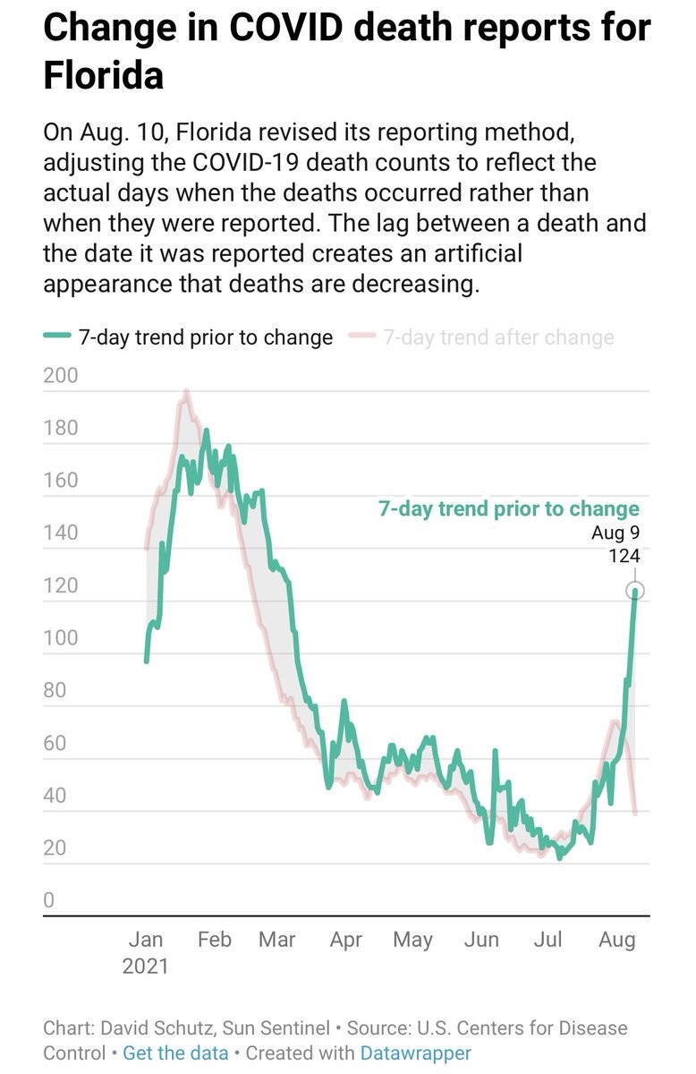 ⚠️DISTORTING DEATH TREND—Florida changed how it reports deaths. Result? Fewer recent “new deaths”. While deaths looks like going “down”—in actuality—deaths are going up in the more common reporting method, by taking advantage of delays. Lowdown—🧵