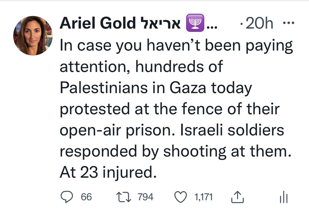 Twitter has suspended our national co-director @ArielElyseGold for no reason again. These were her most recent tweets. Help us tell @Twitter @TwitterSupport to reinstate her account immediately.