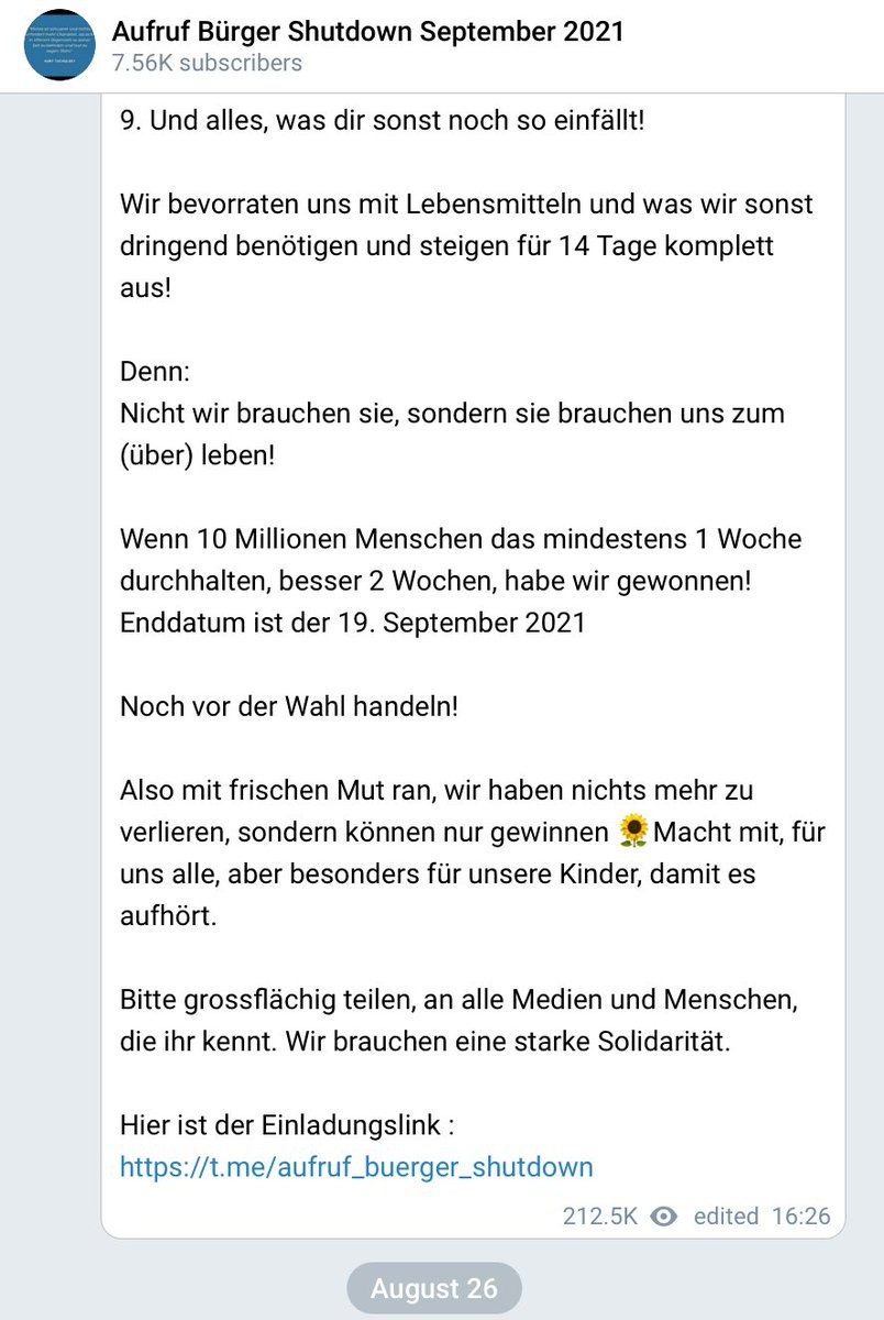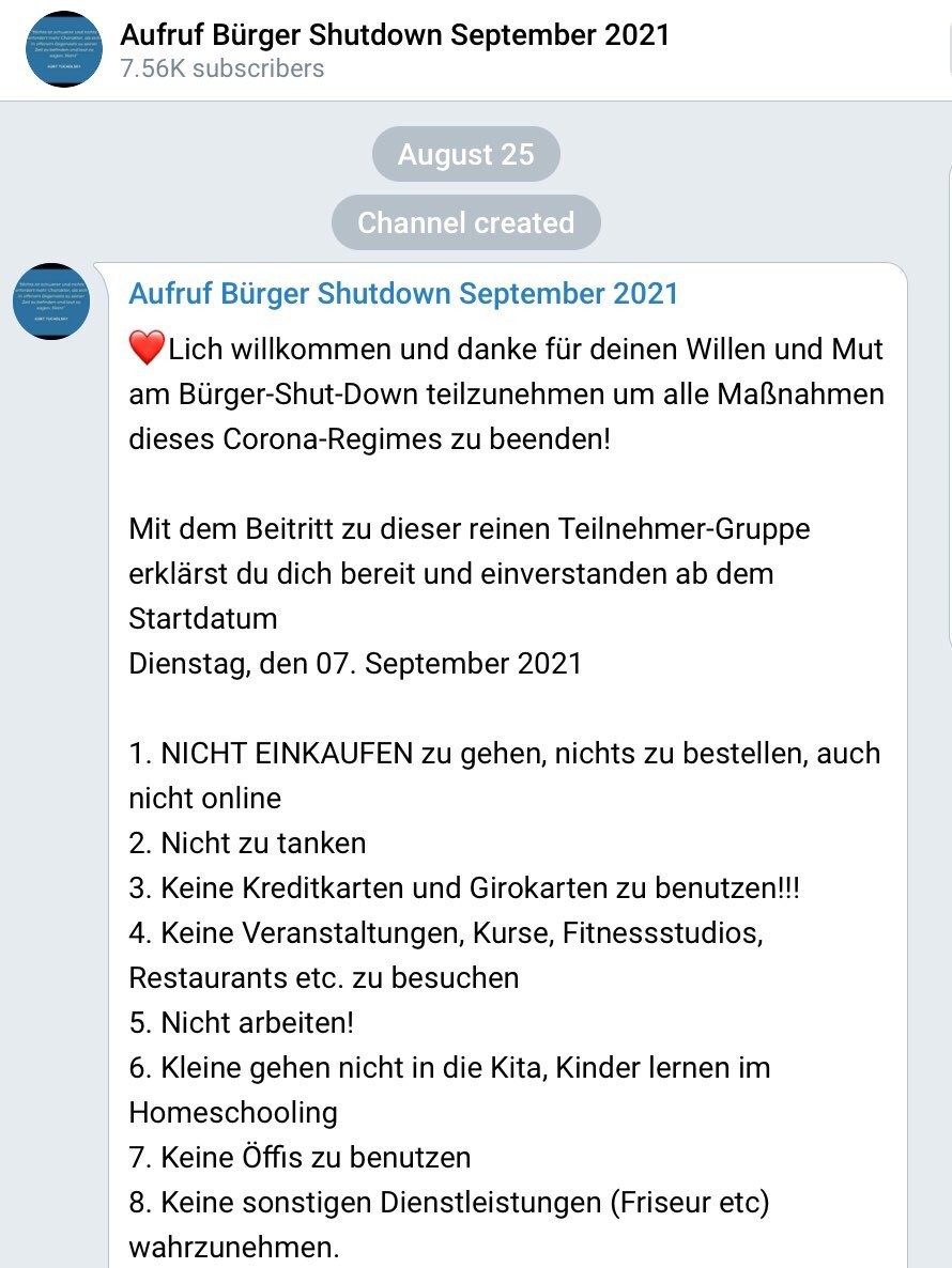 Dieser Telegram-Kanal bittet darum, diesen Aufruf gegen„Corona-Regime“ großflächig zu teilen.