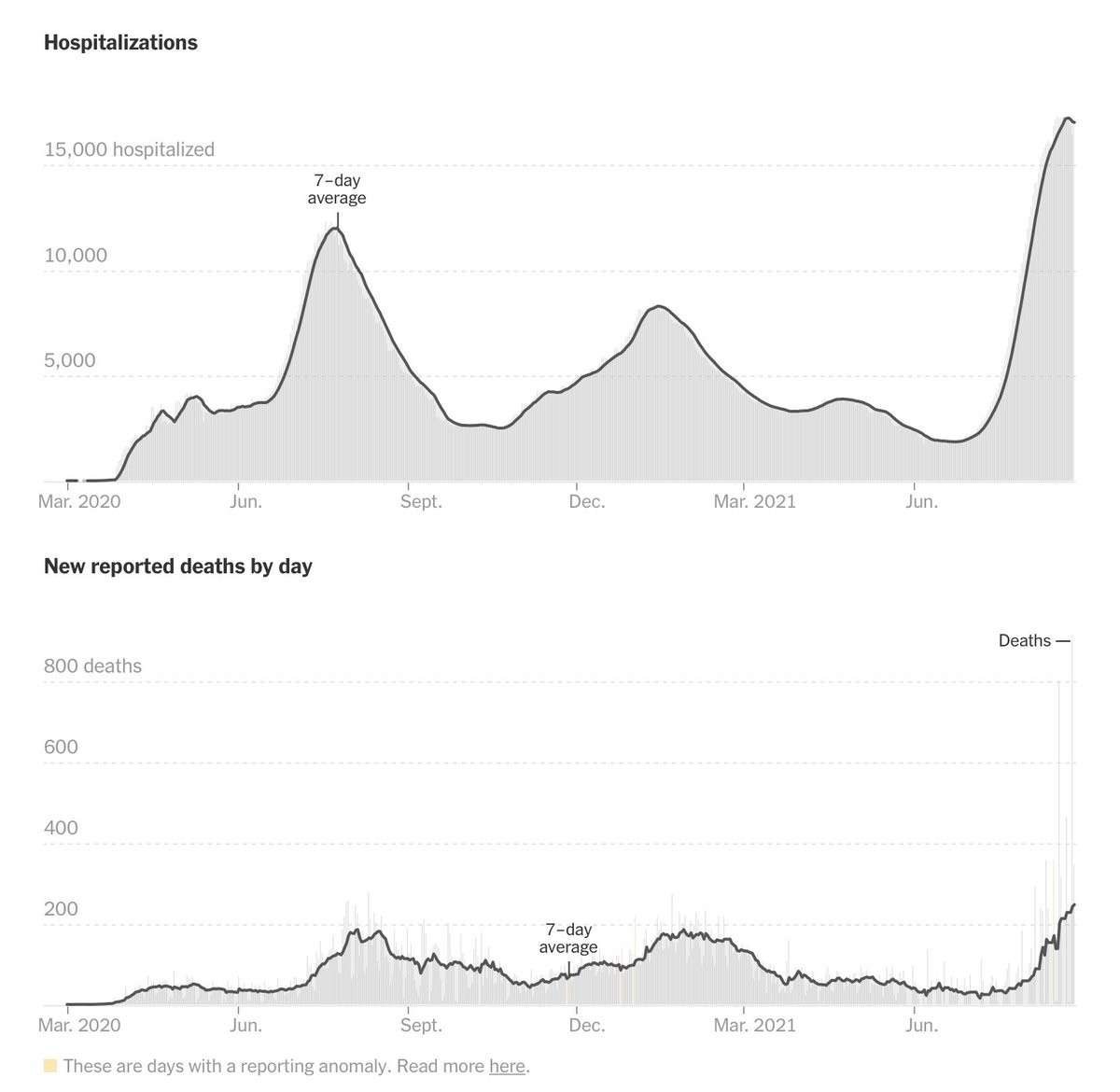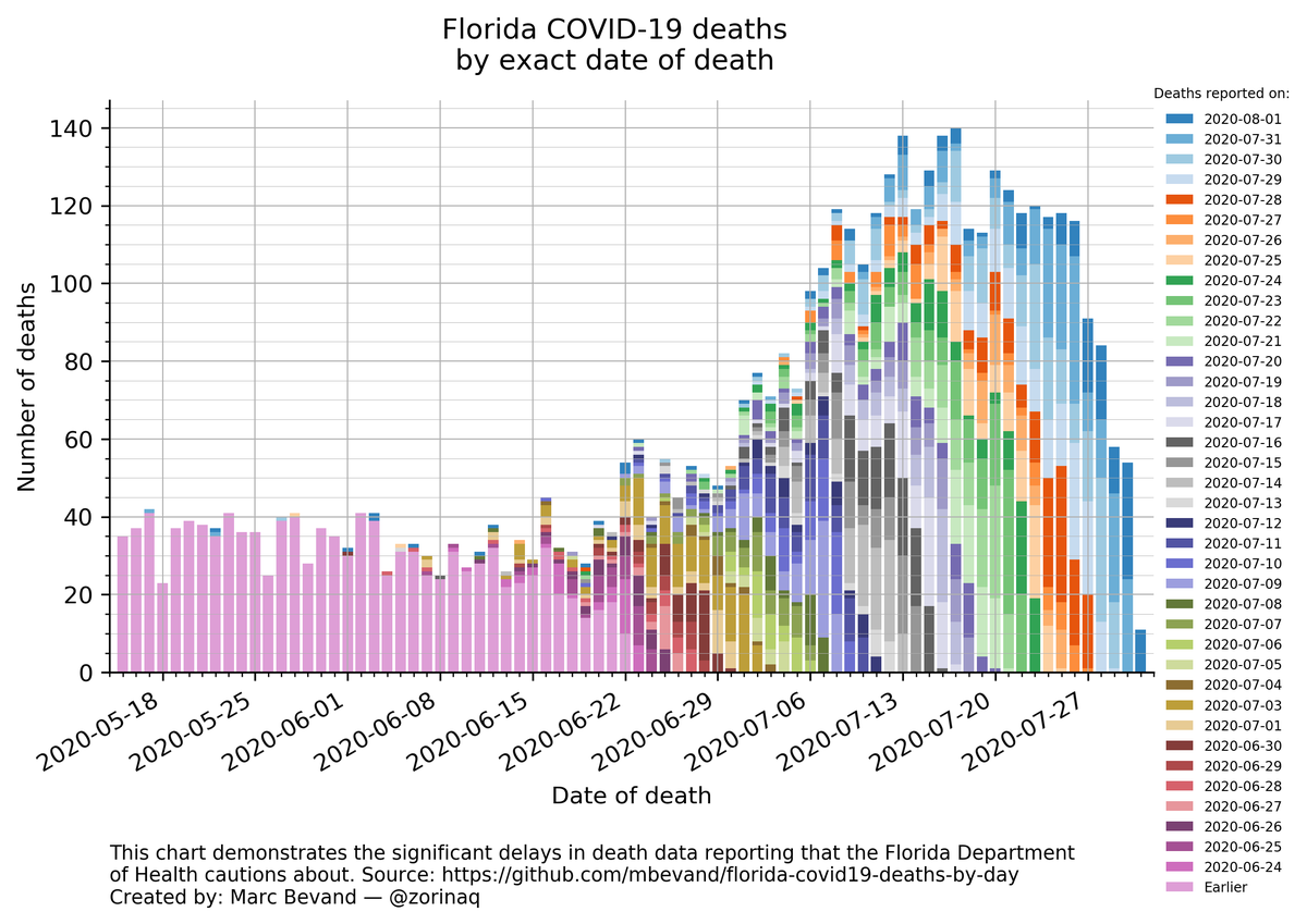 I made a bar chart of COVID-19 deaths in Florida by exact date of death. I took care of choosing just the right coloring to emphasize the significant delays in reporting deaths.