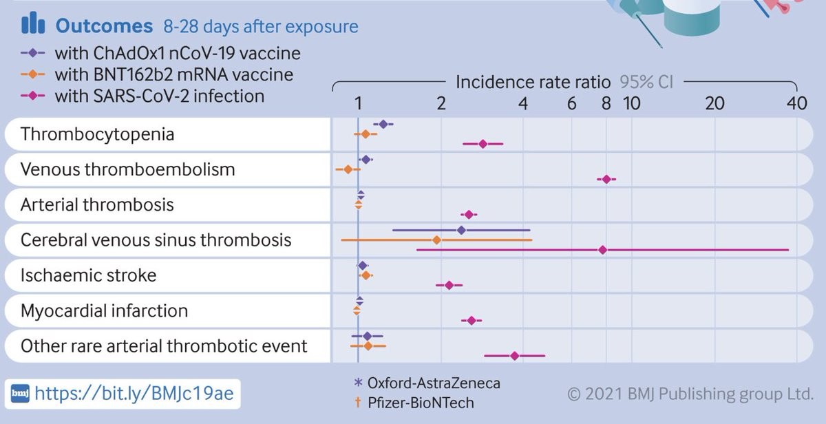 Risiko f Thrombocytopenie und Hirnvenenthrombose wesentlich stärker erhöht durch die Infektion als durch die Impfung.