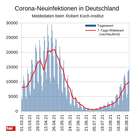 Die Zahl der gemeldeten -Neuinfektionen steigt weiterhin deutlich, aber weniger stark als in den letzten Wochen. Der Tageswert von 14.251 liegt 18 % höher als vor 1 Woche. Der 7-Tage-Mittelwert steigt damit auf 10.075 Fälle/Tag; das sind 16 % mehr als vor 1 Woche. [1/x]