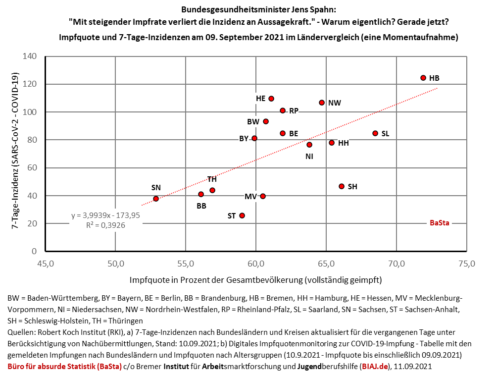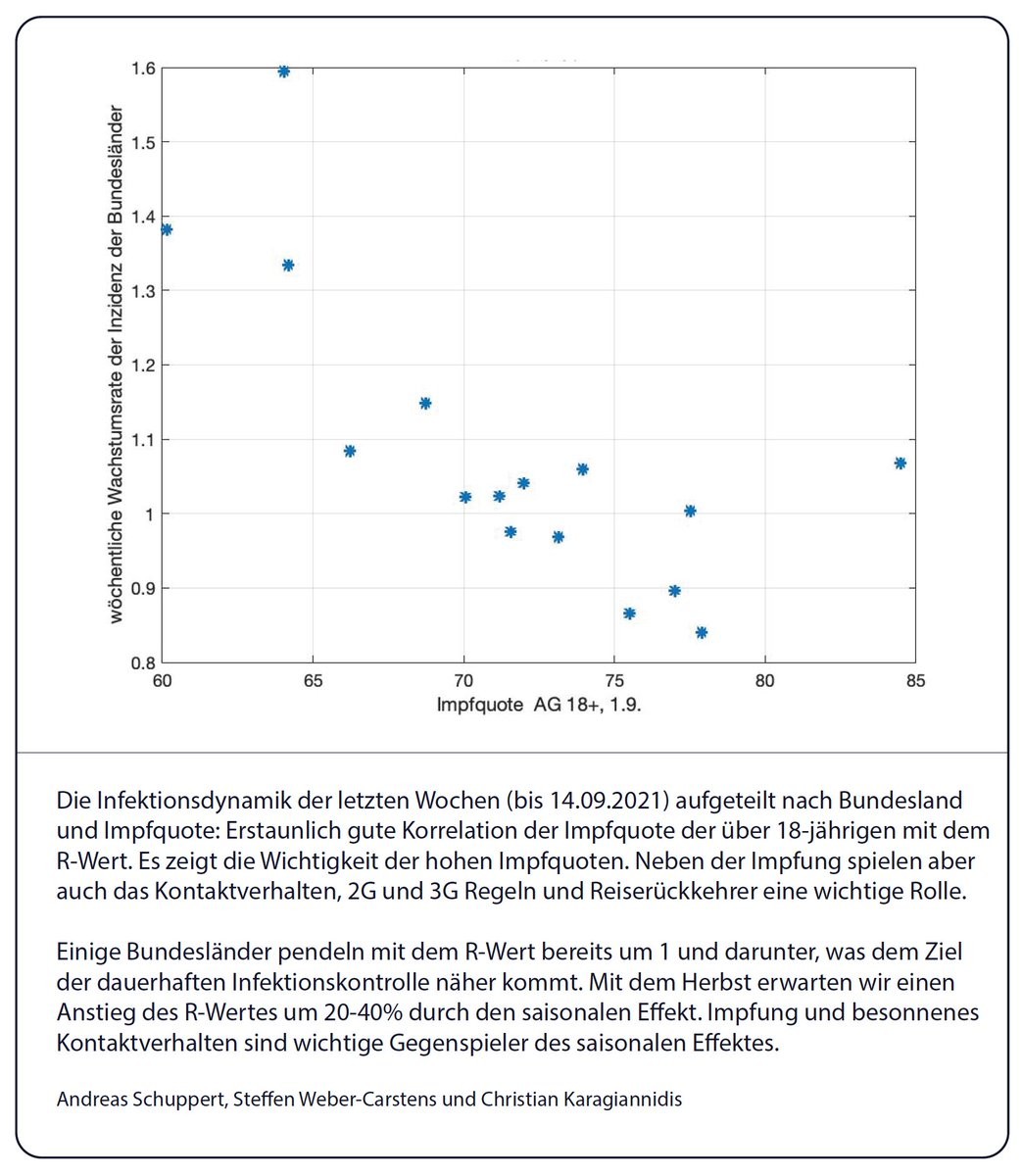 In den letzten Wochen korreliert die Infektionsdynamik (R-Wert) von #Covid_19 auf Bundeslandebene recht gut mit der #Impfquote. Einige BL mit hohen Impfquoten sind mit dem R-Wert bereits um 1 und niedriger.