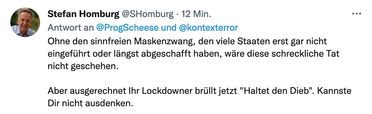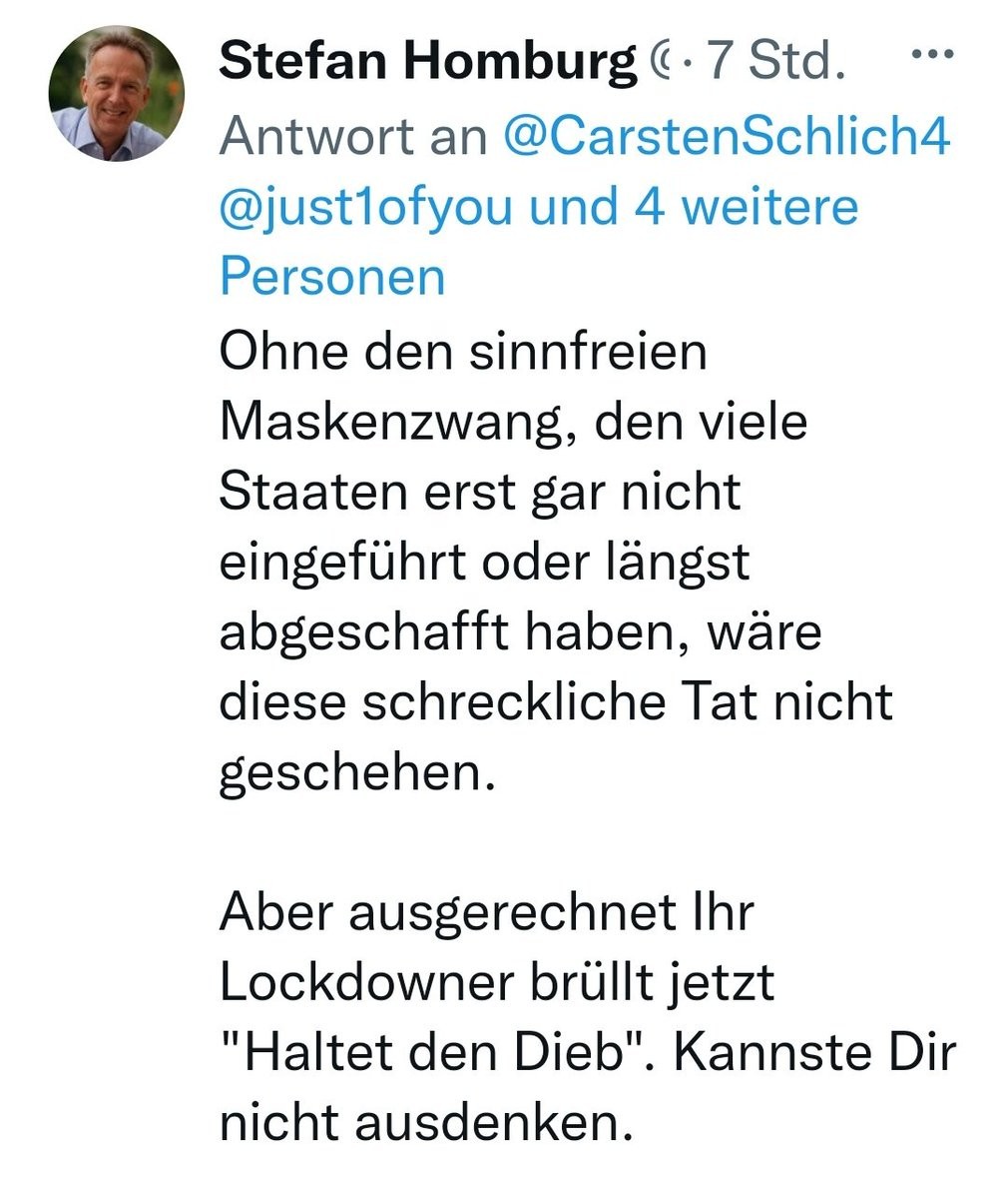 Wenn du meinst, nicht der #Mörder sei Schuld, sondern die Maskenpflicht, dann betreibt du Täter_Opfer_Umkehr.
