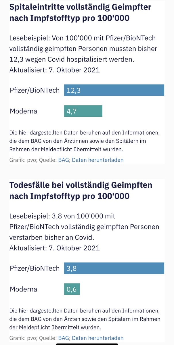 Das BAG hat erstmals Daten zu Impfdurchbrüchen nach Vakzin aufgeschlüsselt. Dabei zeigt sich das gleiche Bild, das mittlerweile in vielen Untersuchungen festgestellt wurde: Der Impfstoff von Moderna schützt besser als jener von Pfizer/Biontech. https://www.tagesanzeiger.ch/erstmals-zeigen-schweizer-daten-moderna-schuetzt-besser-736655305466