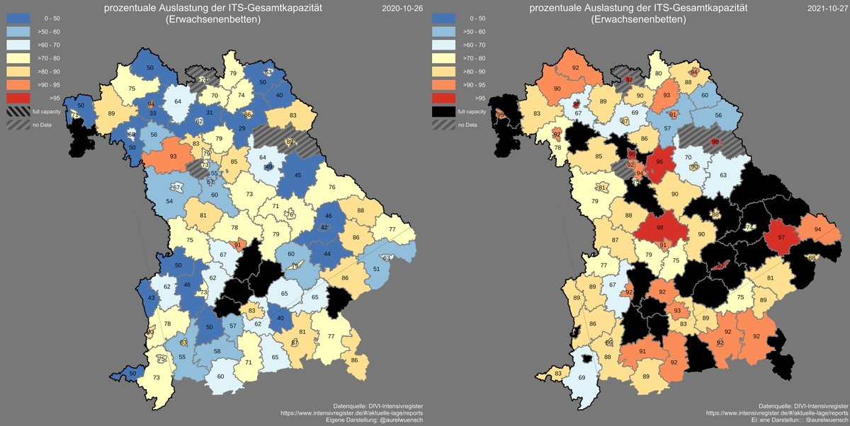 Auslastung bayrische Intensivstationen in Prozent (Schwarz = komplett belegt) Links 26.10.2020, Rechts 27.10.2021 (beides Mittwoch). Patientenzahl absolut: 2020: 156 --- 2021: 360 (12.11.2020 waren es auch 360). Aus Inzidenz abgeleitete Schätzung für nächste Woche: ~500.