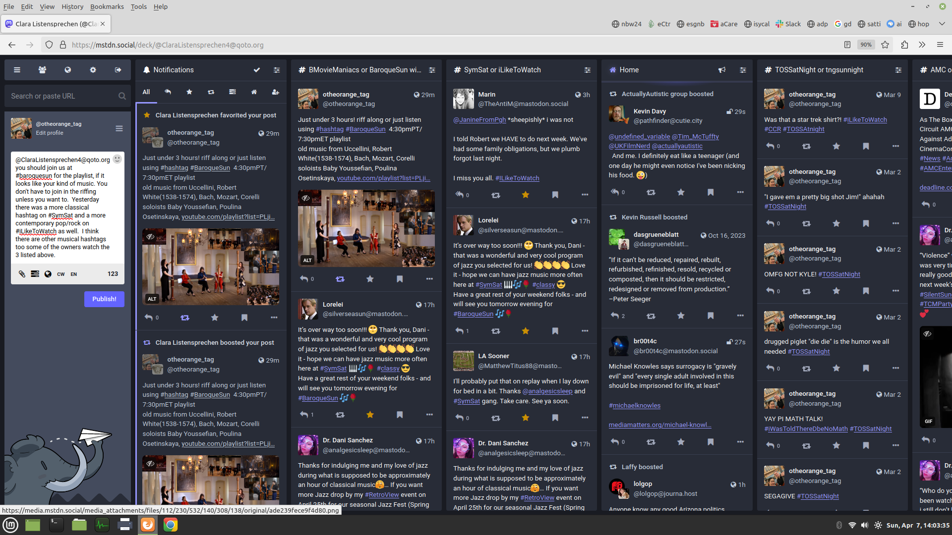 @ClaraListensprechen4 you should join us at #baroquesun for the playlist, if it looks like your kind of music. You don't have to join in the riffing unless you want to. Yesterday there was a more classical hashtag on #SymSat and a more contemporary pop/rock on #iLikeToWatch as well. I think there are other musical hashtags too some of the owners watch the 3 listed above. You can see my setup here (I have columns of hashtags to keep track)