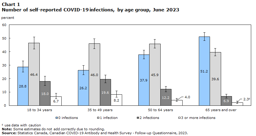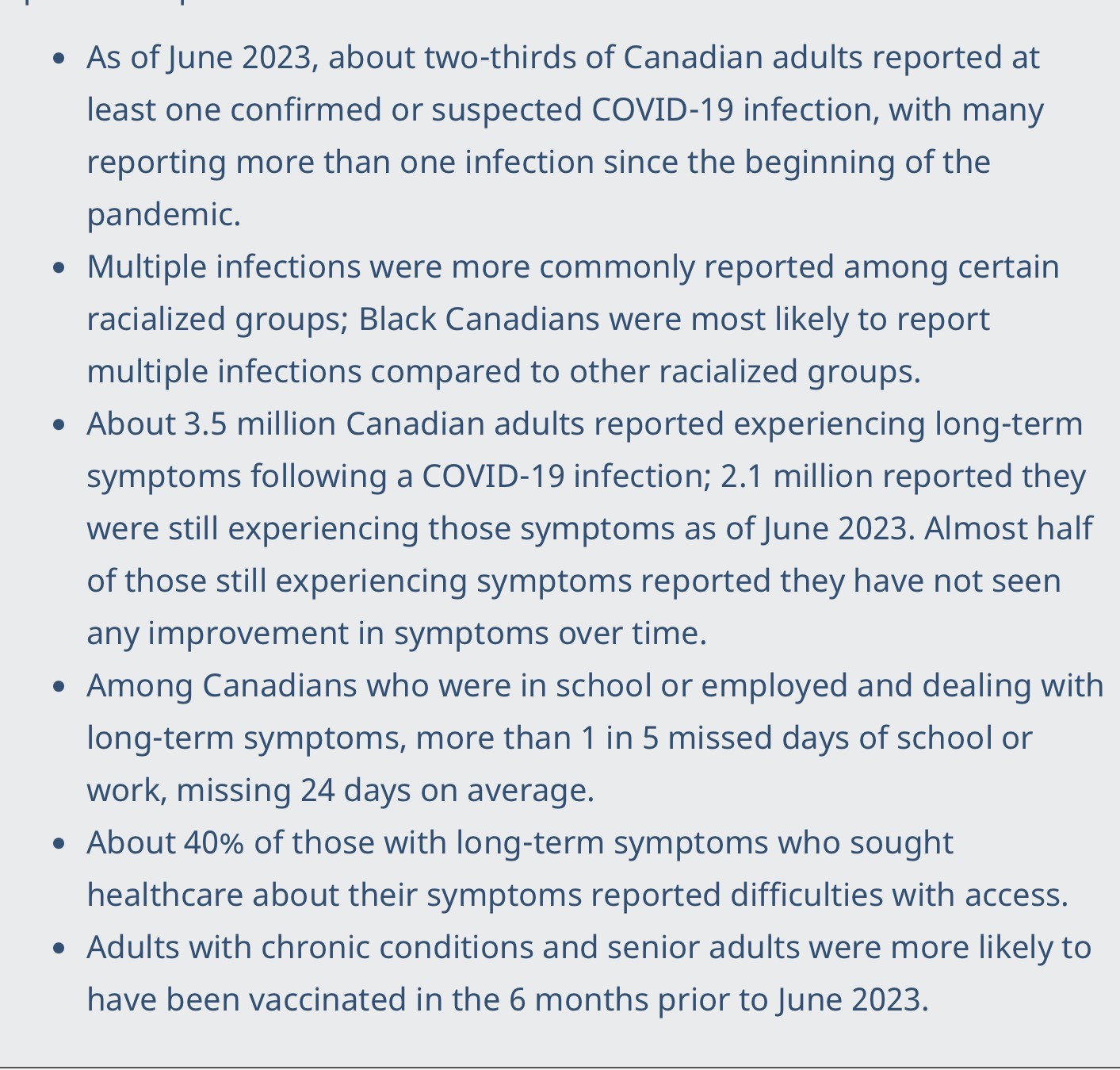 “About 3.5 million Canadian adults reported experiencing long-term symptoms following a COVID-19 infection; 2.1 million reported they were still experiencing those symptoms as of June 2023. Almost half of those still experiencing symptoms reported they have not seen any improvement in symptoms over time.” via Statcan