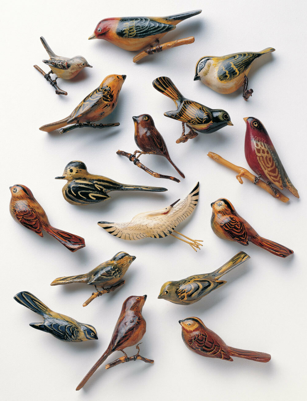 Bird pins (brooches) made out of scrap materials by Japanese Americans held in internment camps during World War II.