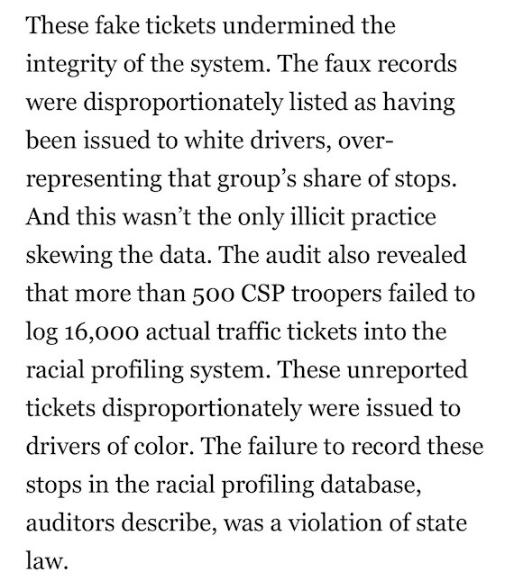 The finding is key to a damning new audit of the Connecticut State Police, which reveals pervasive trooper malfeasance, including at least 26,000 false tickets logged over seven years, that masked racial bias in the force’s policing. https://www.rollingstone.com/politics/politics-features/connecticut-police-trooper-1000-fake-tickets-1234789116/